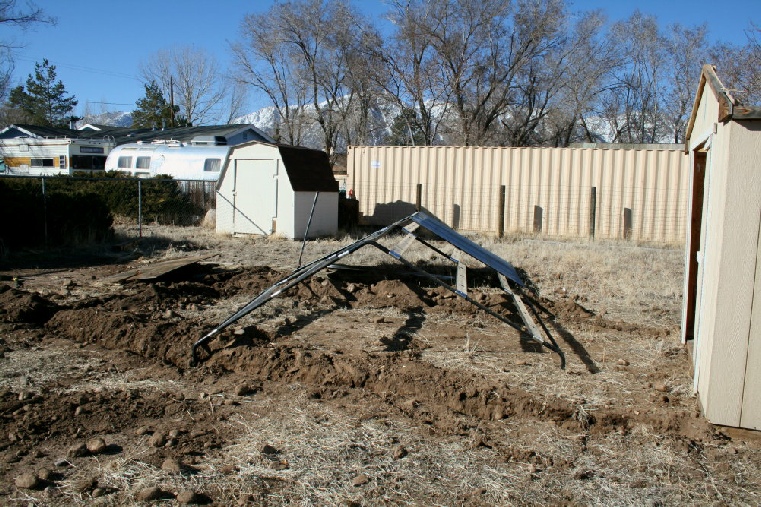 In this picture the coop used to be on the left where the chunk of plywood is lying on the ground. The framework on the ground is the carport pipe structure that was the old run, moved from the old house.